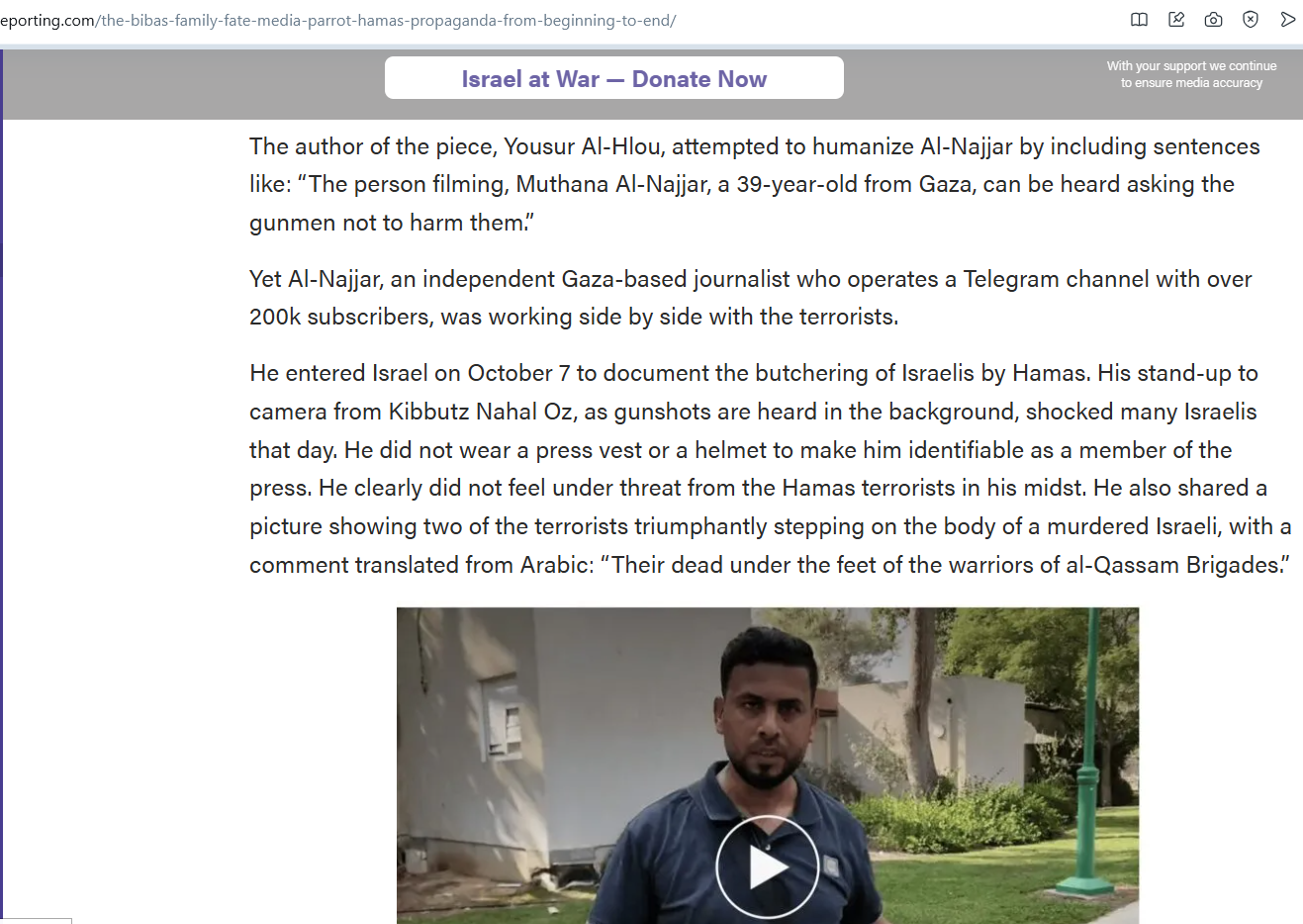 Incitement #26Yet Al-Najjar, an independent Gaza-based journalist who operates a Telegram channel with over 200k subscribers, was working side by side with the terrorists. He entered Israel on October 7 to document the butchering of Israelis by Hamas. His stand-up to camera from Kibbutz Nahal Oz, as gunshots are heard in the background, shocked many Israelis that day. He did not wear a press vest or a helmet to make him identifiable as a member of the press. He clearly did not feel under threat from the Hamas terrorists in his midst.