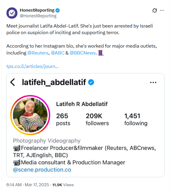 Incitement #22Meet journalist Latifa Abdel-Latif. She's just been arrested by Israeli police on suspicion of inciting and supporting terror. According to her Instagram bio, she's worked for major media outlets, including @Reuters , @ABC & @BBCNews . š§µ