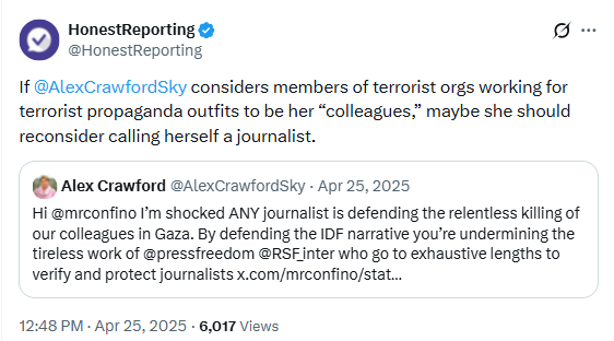Incitement #23If @AlexCrawfordSky considers members of terrorist orgs working for terrorist propaganda outfits to be her ācolleagues,ā maybe she should reconsider calling herself a journalist.