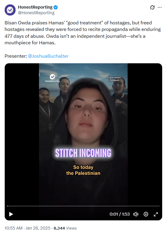 Incitement #28Bisan Owda praises Hamas' "good treatment" of hostages, but freed hostages revealed they were forced to recite propaganda while enduring 477 days of abuse. Owda isnāt an independent journalistāsheās a mouthpiece for Hamas. Presenter: @JoshuaBuchalter