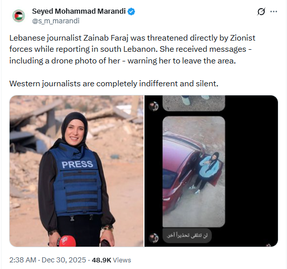Lebanese journalist Zainab Faraj was threatened directly by Zionist forces while reporting in south Lebanon. She received messages - including a drone photo of her - warning her to leave the area. Western journalists are completely indifferent and silent.