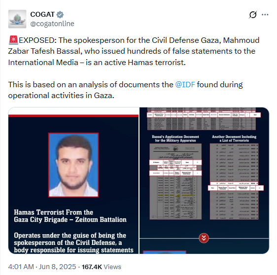 🚨EXPOSED: The spokesperson for the Civil Defense Gaza, Mahmoud Zabar Tafesh Bassal, who issued hundreds of false statements to the International Media – is an active Hamas terrorist. This is based on an analysis of documents the @IDF found during operational activities in Gaza.