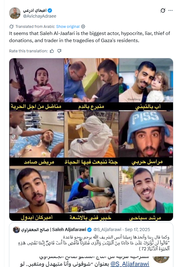 Incitement #76A comedic play produced by the so-called Saleh Al-Jaafari @S_Aljafarawi titled "Look at Me While I'm Messed Up and Dusty.. If You Please, 10 Thousand Dollars in Donations" These types of people, born from the womb of bankrupt Hamas and the Brotherhood, trade only on people's tragedies and suffering, nothing more