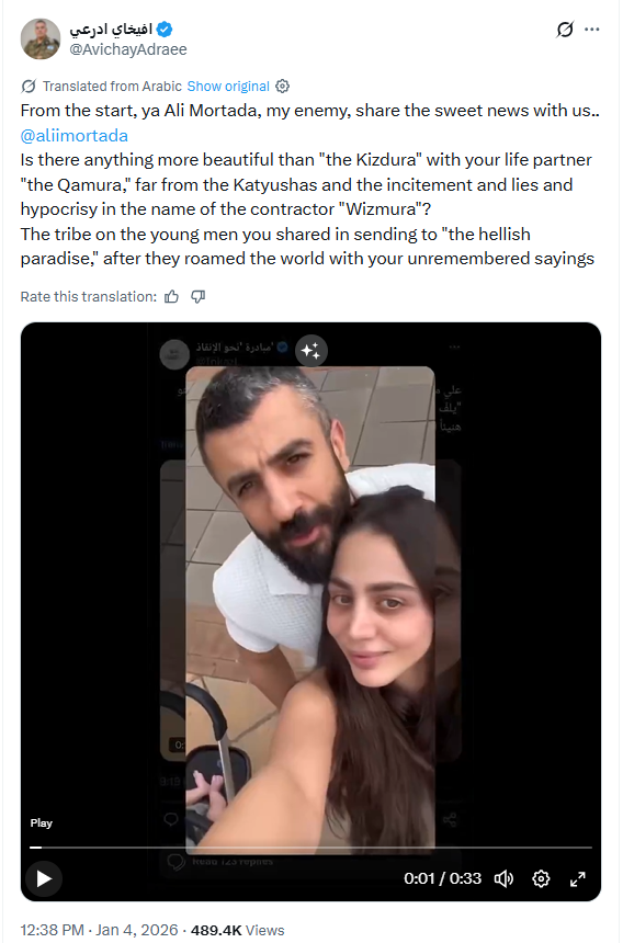 Incitement #92From the start, ya Ali Mortada, my enemy, share the sweet news with us.. @aliimortada Is there anything more beautiful than "the Kizdura" with your life partner "the Qamura," far from the Katyushas and the incitement and lies and hypocrisy in the name of the contractor "Wizmura"? The tribe on the young men you shared in sending to "the hellish paradise," after they roamed the world with your unremembered sayings