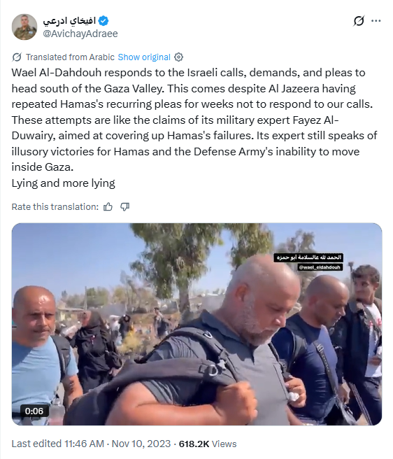 Incitement #38Wael Al-Dahdouh responds to the Israeli calls, demands, and pleas to head south of the Gaza Valley. This comes despite Al Jazeera having repeated Hamas's recurring pleas for weeks not to respond to our calls. These attempts are like the claims of its military expert Fayez Al-Duwairy, aimed at covering up Hamas's failures. Its expert still speaks of illusory victories for Hamas and the Defense Army's inability to move inside Gaza. Lying and more lying