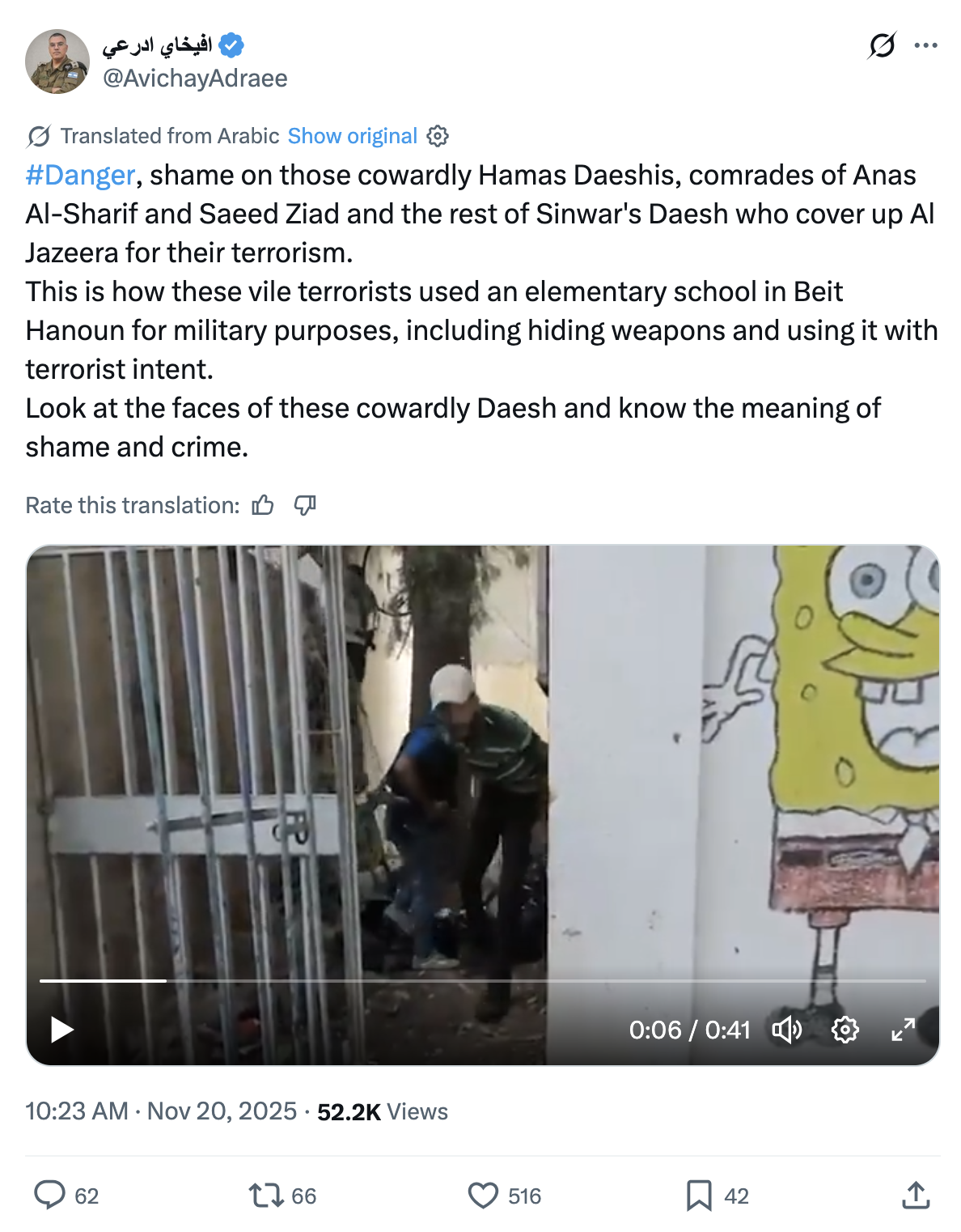 Incitement #90#Danger, shame on those cowardly Hamas Daeshis, comrades of Anas Al-Sharif and Saeed Ziad and the rest of Sinwar's Daesh who cover up Al Jazeera for their terrorism. This is how these vile terrorists used an elementary school in Beit Hanoun for military purposes, including hiding weapons and using it with terrorist intent. Look at the faces of these cowardly Daesh and know the meaning of shame and crime.