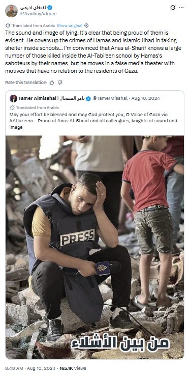 Incitement #4The sound and image of lying. It's clear that being proud of them is evident. He covers up the crimes of Hamas and Islamic Jihad in taking shelter inside schools... I'm convinced that Anas al-Sharif knows a large number of those killed inside the Al-Tabi'een school by Hamas's saboteurs by their names, but he moves in a false media theater with motives that have no relation to the residents of Gaza.