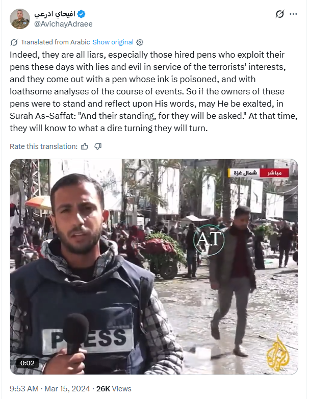 Incitement #44The so-called journalist @AnasAlSharif0 proves once again the extent of his hypocrisy: The Defense Army admits to eliminating 50 saboteurs inside the Al-Shifa Medical Complex and capturing more than 100 others. This "journalist," who suddenly donned the media vest during the war, lies once again. He knows how Hamas uses Al-Shifa Hospital for terrorist purposes, yet he serves Hamas's false claims in service of its agenda that brought only destruction and ruin to Gaza. We will soon dismantle the claims and lies of this "journalist" with evidence.