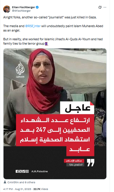 Incitement #63Info collected so far on the "journalists" killed in Gaza today 🧵 Mohammed Salama of Al Jazeera was a terrorist who invaded Israel on October 7. Mariam Abu Daqqa, who did work for the @AP, taught "journalism" courses for the Hamas "information ministry". Mariam is also alleged to have been a close colleague of Hamas terrorist Hassan Aslih (who posed as a journalist). As demonstrated by the great @chalavyishmael, Ahmed Hazem Shahin was a truly evil man. Muath [Moaz] abu Taha of NBC had a lovely profile picture in 2014. And in 2018, he glorified Ahmad Jarrar, a Hamas terrorist who coordinated the terror attack in which Rabbi Raziel Shevach, a father of six, was murdered. Jarrar was subsequently killed in a shootout with the IDF.