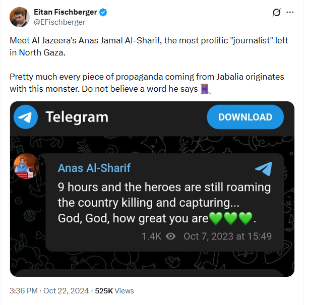 Incitement #13Meet Al Jazeera's Anas Jamal Al-Sharif, the most prolific "journalist" left in North Gaza. Pretty much every piece of propaganda coming from Jabalia originates with this monster. Do not believe a word he says 🧵