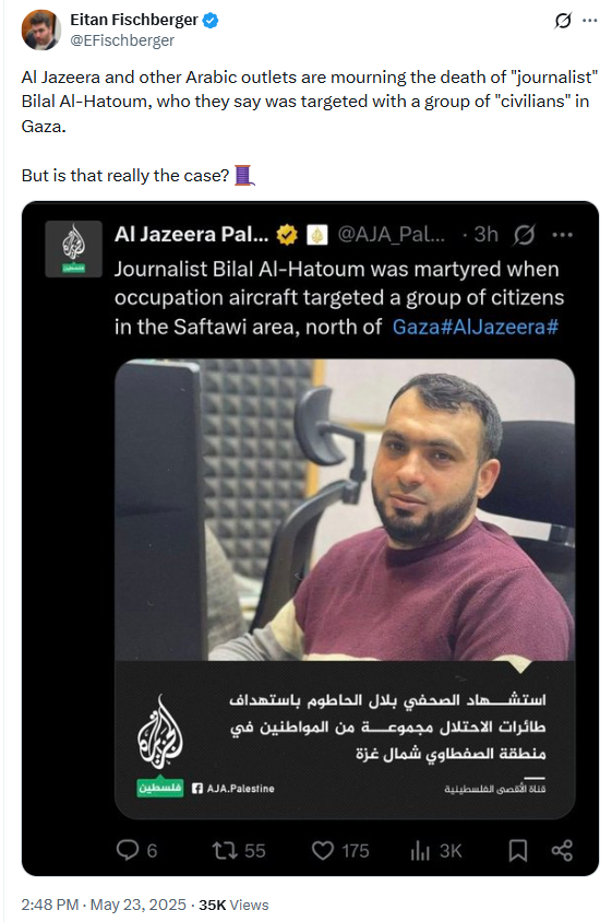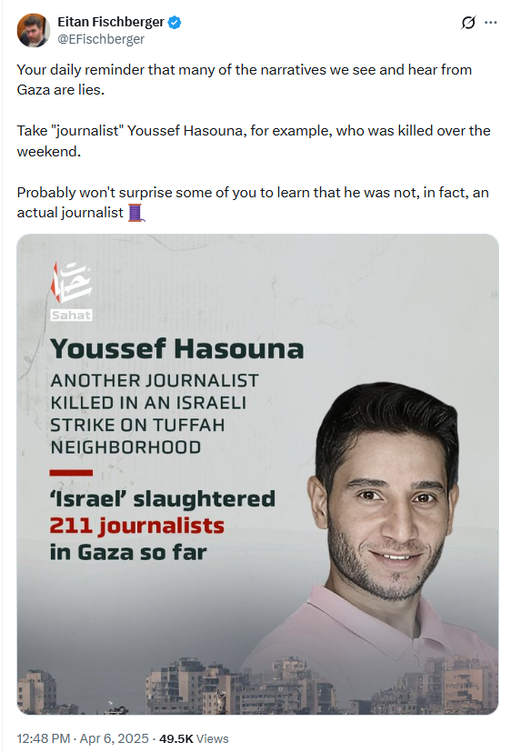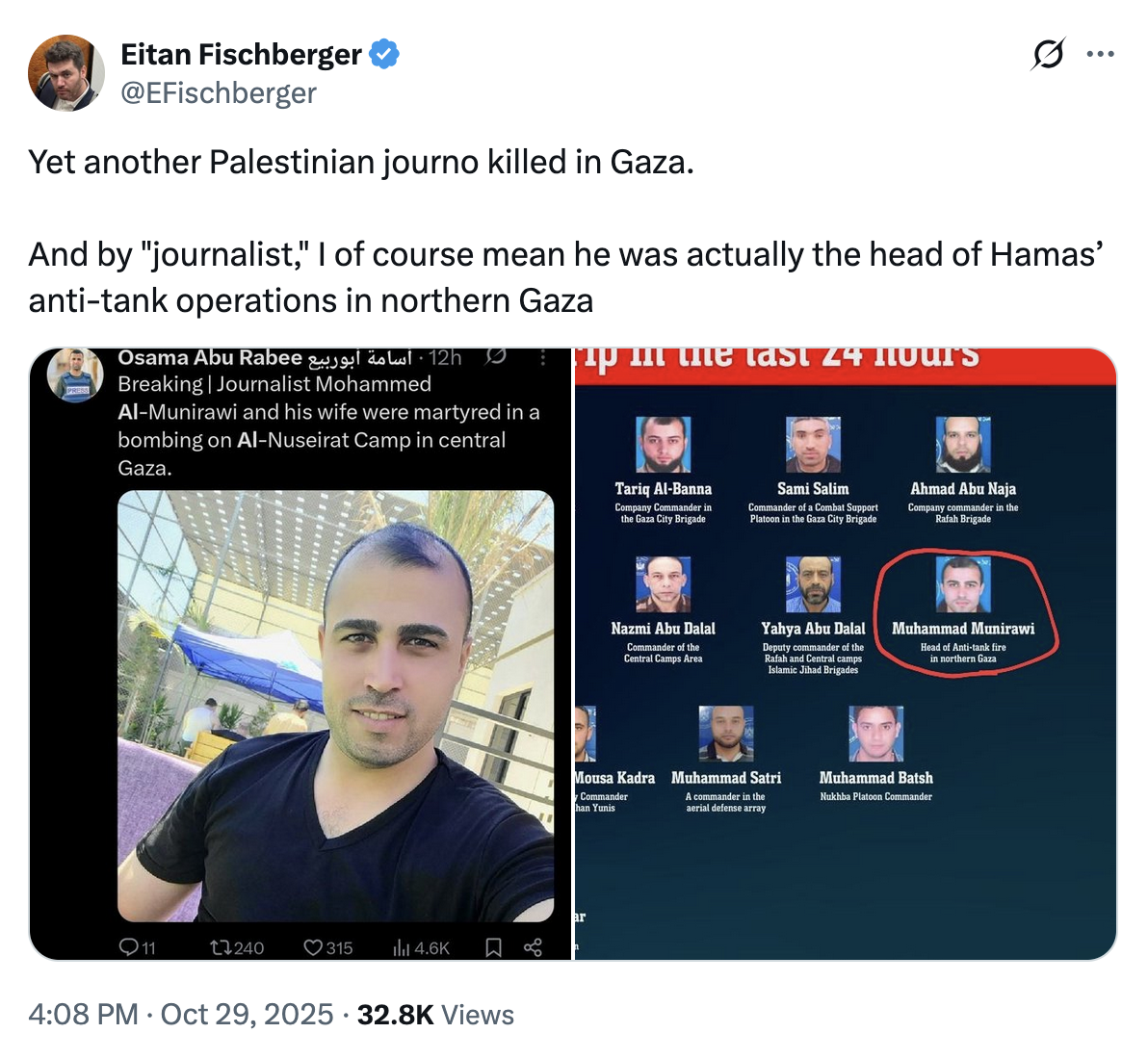 Incitement #86Yet another Palestinian journo killed in Gaza. And by "journalist," I of course mean he was actually the head of Hamas’ anti-tank operations in northern Gaza