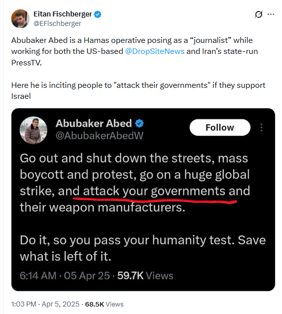 Incitement #30Abubaker Abed is a Hamas operative posing as a “journalist” while working for both the US-based @DropSiteNews and Iran’s state-run PressTV. Here he is inciting people to "attack their governments" if they support Israel