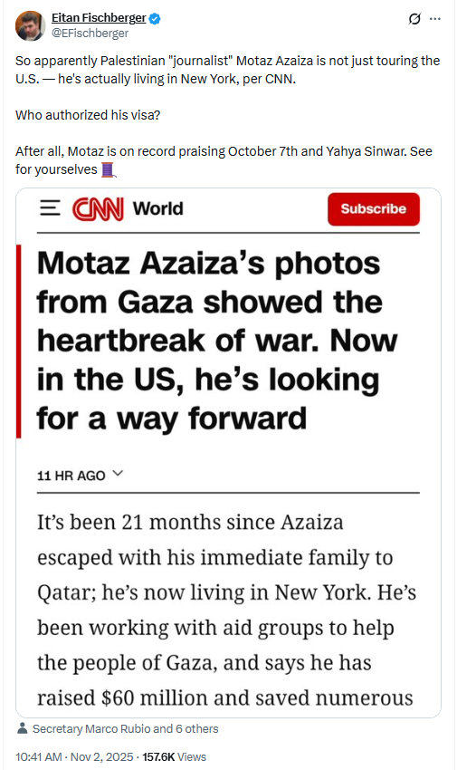 Incitement #88So apparently Palestinian "journalist" Motaz Azaiza is not just touring the U.S. — he's actually living in New York, per CNN. Who authorized his visa? After all, Motaz is on record praising October 7th and Yahya Sinwar. See for yourselves 🧵