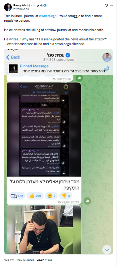 This is Israeli journalist @AmitSegal . You’d struggle to find a more repulsive person. He celebrates the killing of a fellow journalist and mocks his death. He writes: “Why hasn’t Hassan updated the news about the attack?” —after Hassan was killed and his news page silenced.