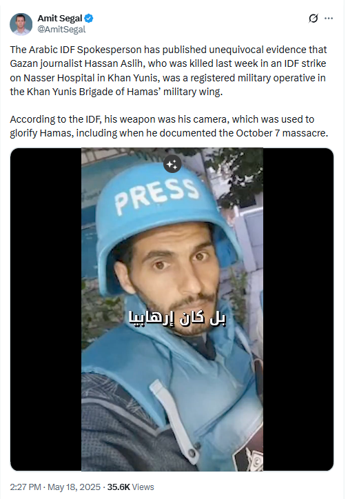 The Arabic IDF Spokesperson has published unequivocal evidence that Gazan journalist Hassan Aslih, who was killed last week in an IDF strike on Nasser Hospital in Khan Yunis, was a registered military operative in the Khan Yunis Brigade of Hamas’ military wing. According to the IDF, his weapon was his camera, which was used to glorify Hamas, including when he documented the October 7 massacre.