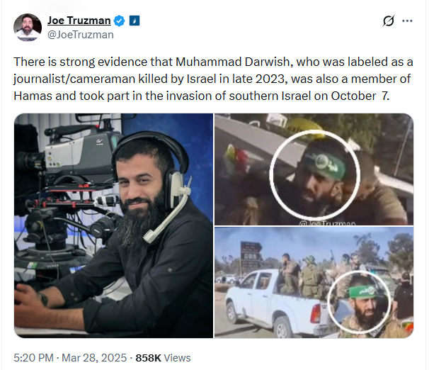 There is strong evidence that Muhammad Darwish, who was labeled as a journalist/cameraman killed by Israel in late 2023, was also a member of Hamas and took part in the invasion of southern Israel on October 7.