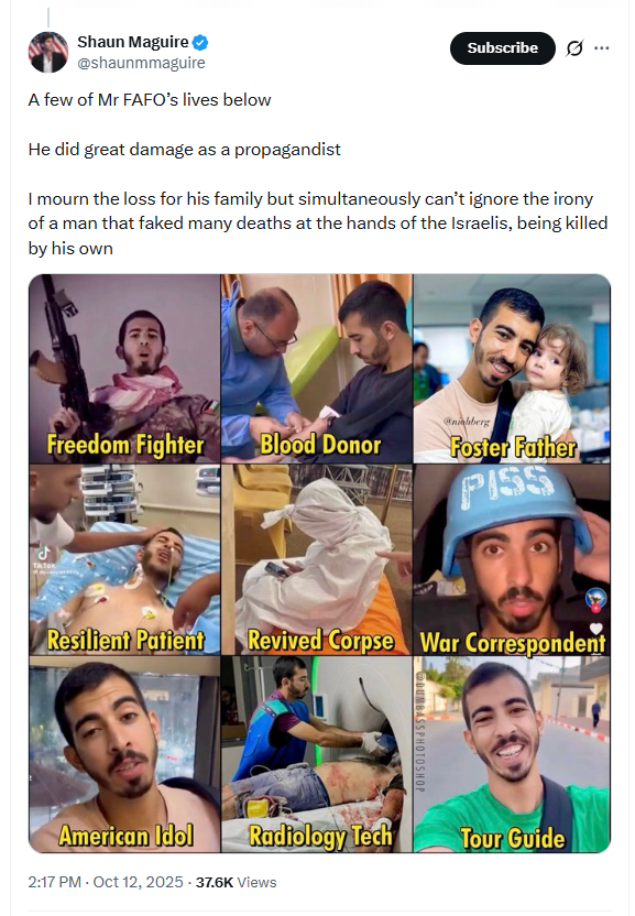 Incitement #78A few of Mr FAFO’s lives below He did great damage as a propagandist I mourn the loss for his family but simultaneously can’t ignore the irony of a man that faked many deaths at the hands of the Israelis, being killed by his own