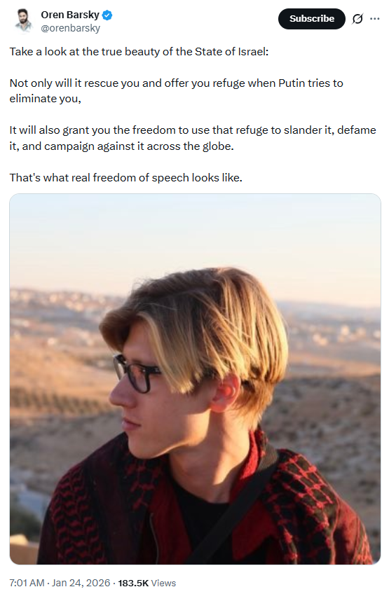 Take a look at the true beauty of the State of Israel: Not only will it rescue you and offer you refuge when Putin tries to eliminate you, It will also grant you the freedom to use that refuge to slander it, defame it, and campaign against it across the globe. That's what real freedom of speech looks like.